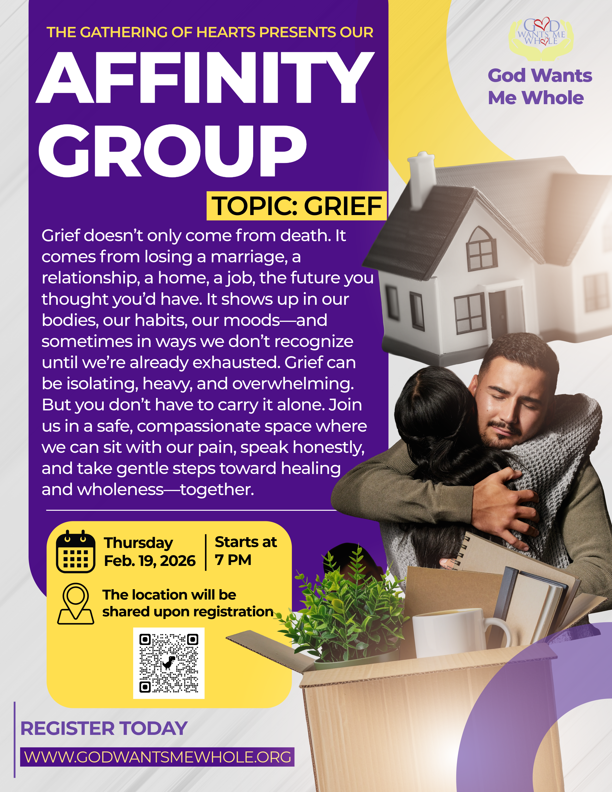 God Wants Me Whole The Gathering of Hearts presents Affinity Groups. These groups will take place at various locations providing a safe space to discuss important real-life topics that affect many of our lives.